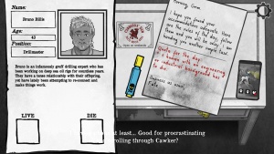Каждое утро приносит вам папку с анкетами, в которых описаны качества и поступки конкретных людей. Вам потребуется внимательно читать директивы начальства, определять, кто из подопечных должен уйти, а кому дозволено продолжать жить. Кроме того, ваши решения влияют на множество факторов, таких как экономика и экология. Каждая ошибка может вызывать цепную реакцию, отражаясь на глобальном состоянии мира, что добавляет сложности и уникальности игровому процессу.