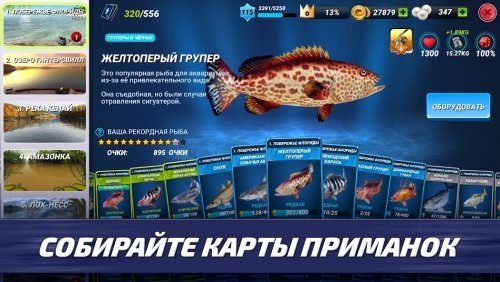 - Открывайте и улучшайте карты приманок, чтобы ловить рыбу редких видов.