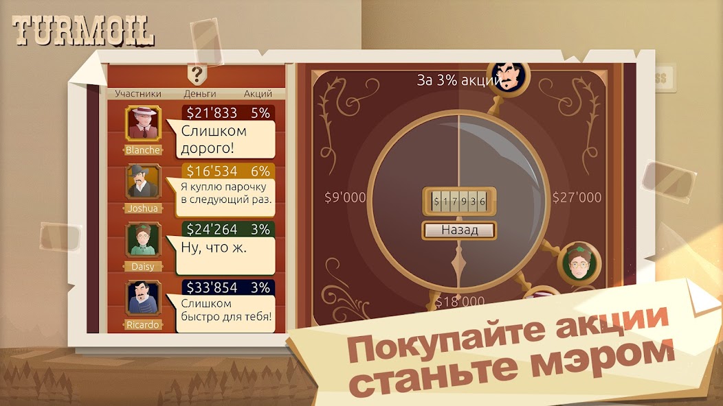 Turmoil — это увлекательная экономическая стратегия, погружающая вас в атмосферу нефтяной лихорадки XIX века в Северной Америке. Ваша основная задача — пройти путь от начинающего предпринимателя до влиятельного нефтяного магната. Вам предстоит участвовать в аукционах за земельные участки, разведывать месторождения, строить буровые вышки и прокладывать трубопроводы. Необходимо грамотно управлять ресурсами, чтобы заработать состояние, обойти конкурентов и в конечном итоге стать мэром процветающего города.