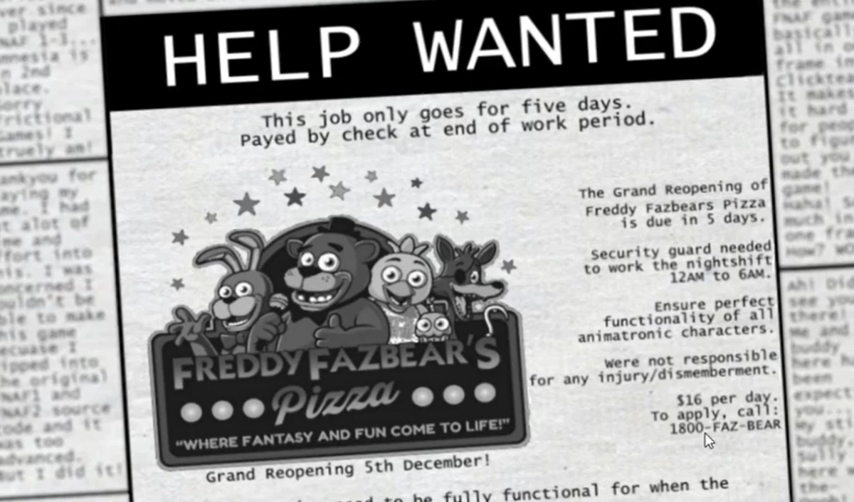 Сюжет Five Nights Before Freddy's развивается между звонками от Телефонного парня и событиями, происходящими после каждой ночи. Вы узнаете, что после пяти смен вас не ждет спокойная жизнь. После жалоб на странное поведение аниматроников руководство компании лишь угрожает увольнением. В итоге, после седьмой ночи, Клайда действительно увольняют, оставляя его историю незавершенной и мрачной.