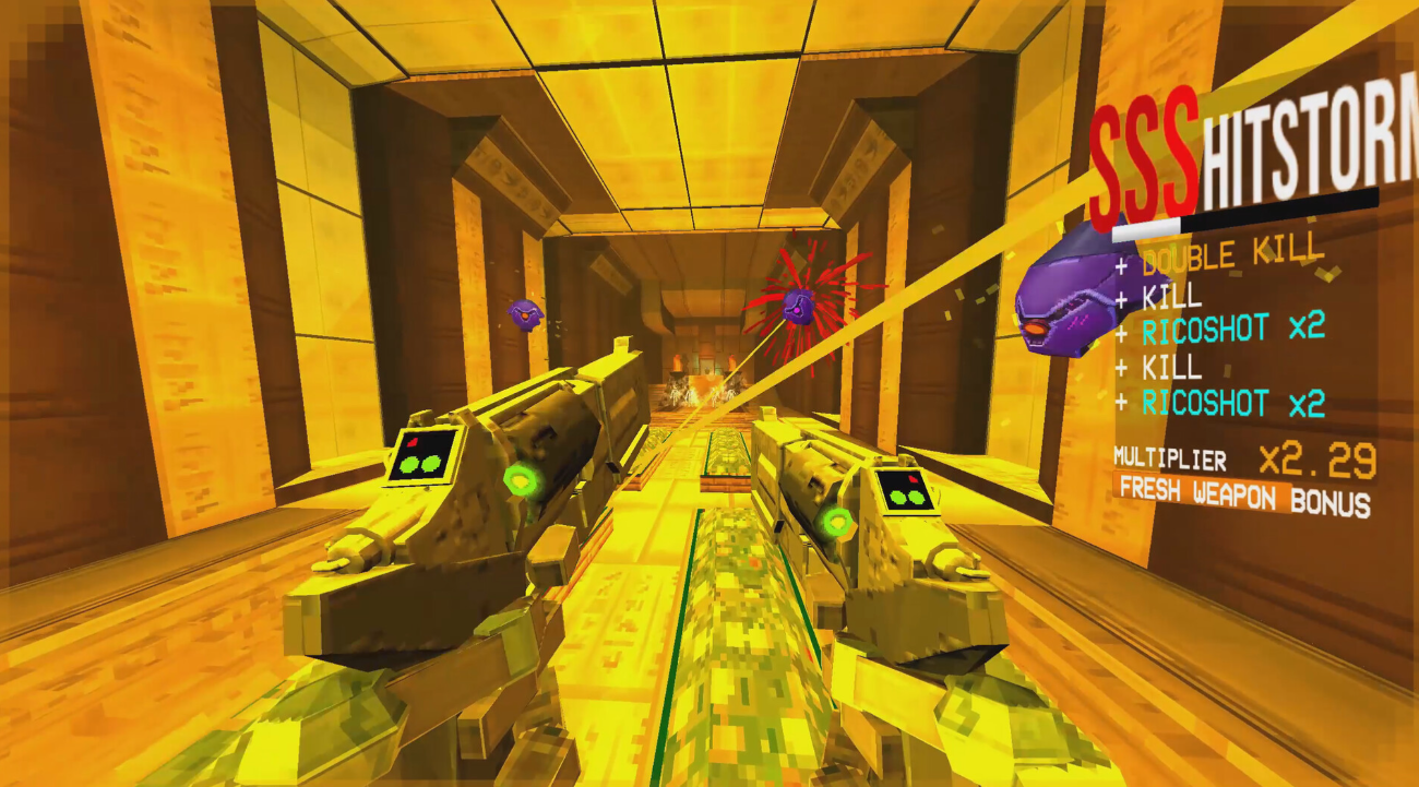 - Каждый ваш выстрел может стать элементом сложного комбо: меняйте оружие на лету, отскакивайте от стен, отражайте снаряды механической рукой, чтобы стиль растирался до невозможности.