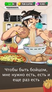 Food Fighter Clicker - переносит игроков в мир кликер-симулятора, где важнейшей задачей становится поедание фастфуда с целью стать лучшим в мире бойцом еды. Удерживая пальцы наготове, вы будете наращивать скорость, размеры рта и желудка, чтобы справляться с еще более масштабными вызовами. Преодолевать уровни можно через прокачку навыков и сбор коллекций уникальных предметов, таких как мебель и костюмы. Совершенствуйте персонажа, чтобы достичь вершин в мире виртуальных мукбангов.