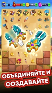 Геймплей Medieval Merge строится на концепции объединения предметов для создания более мощных инструментов и оружия. На игровом поле вы будете находить элементы, которые нужно объединять для выполнения заданий. Например, чтобы добыть топор или молот, вам предстоит комбинировать похожие предметы, улучшая их до следующего уровня. Кроме того, некоторые объекты могут производить материалы после объединения, что добавляет стратегическую глубину задачам. Однако ресурсы, такие как энергия, ограничены, и вам необходимо будет тщательно планировать свои действия.