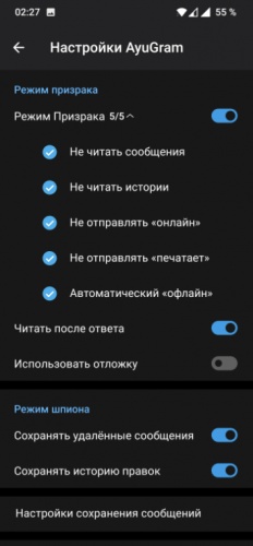 Главной изюминкой выступает режим призрака, благодаря которому вы скрываетесь от других участников даже при отправке сообщений. AyuGram одинаково эффективен как для повседневного, так и для продвинутого использования.