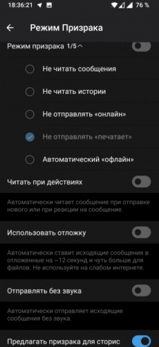 - Режим призрака: скрывает ваш онлайн-статус и активность, включая набор сообщений.
