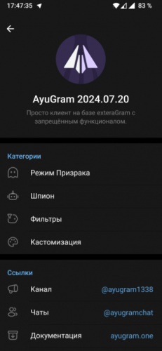 AyuGram – это усовершенствованный клиент Telegram с полным перечнем функций для тех, кто ценит удобство, конфиденциальность и индивидуальный подход. Этот софт дает абсолютный контроль над активностью в мессенджере. Он сочетает сохранение истории сообщений, включая удалённые, и отсутствие рекламы.